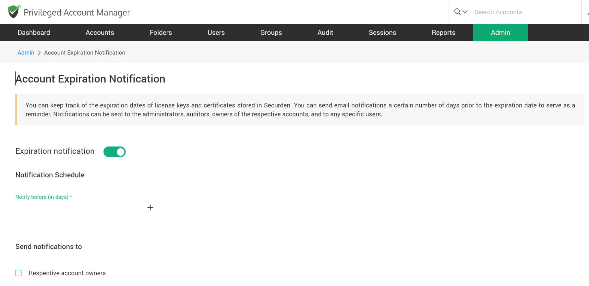 This notification takes into consideration the accounts that have expiration dates mentioned. If you want to configure expiration dates for accounts, you can do so from Admin >> Account Types. You can edit the required account types and include the expiration date field for the accounts that belong to the type.