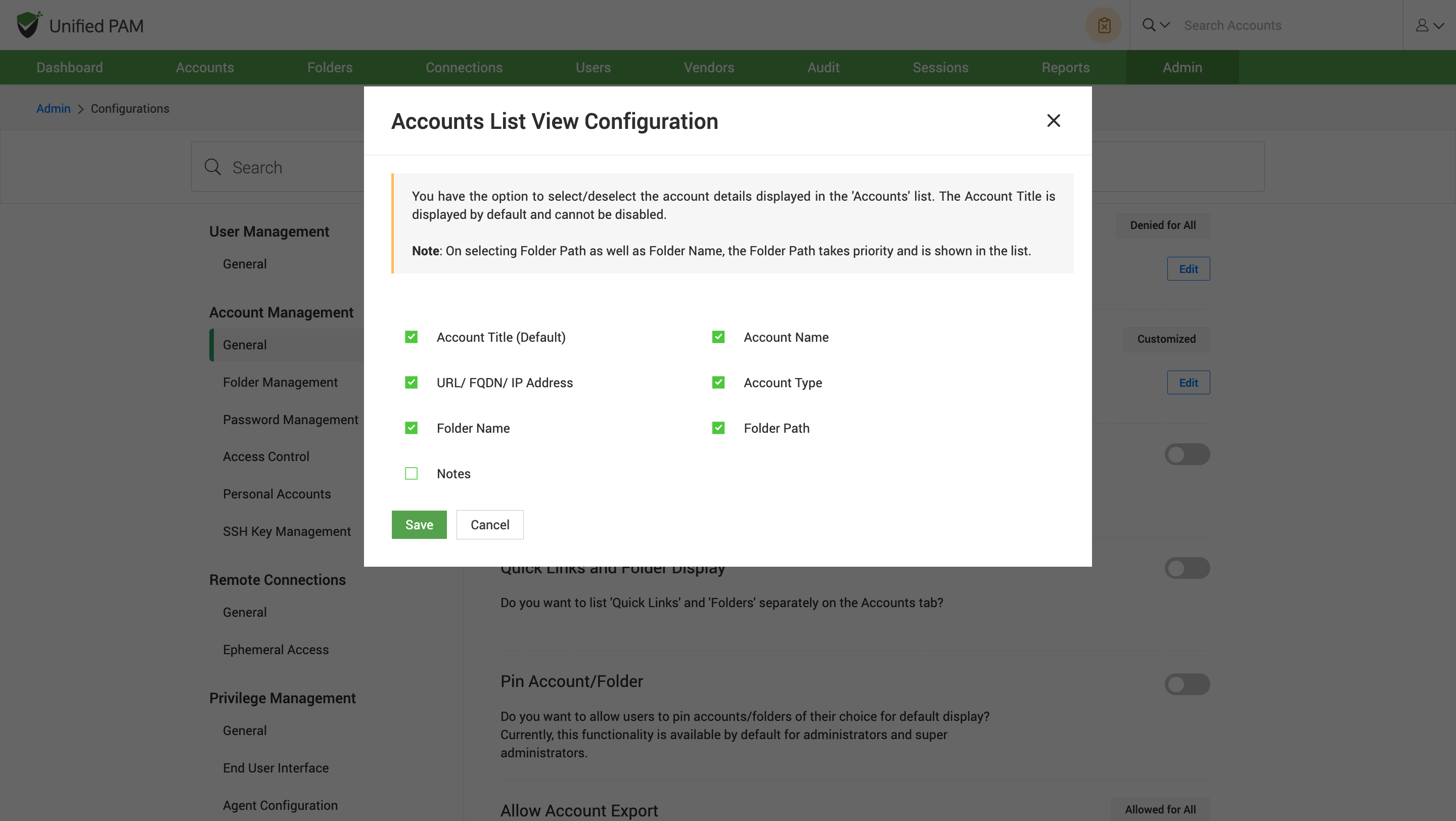 The Account Title is displayed by default and cannot be disabled. On selecting Folder Path as well as Folder Name, the Folder Path takes priority and is shown in the list.