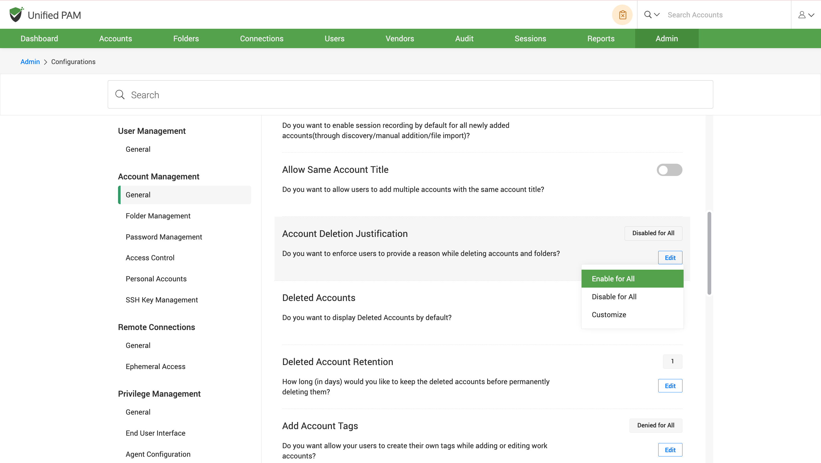 To enable users to provide reason for deleting accounts, select Enable for All and Disable for All to disable the provision of justification.