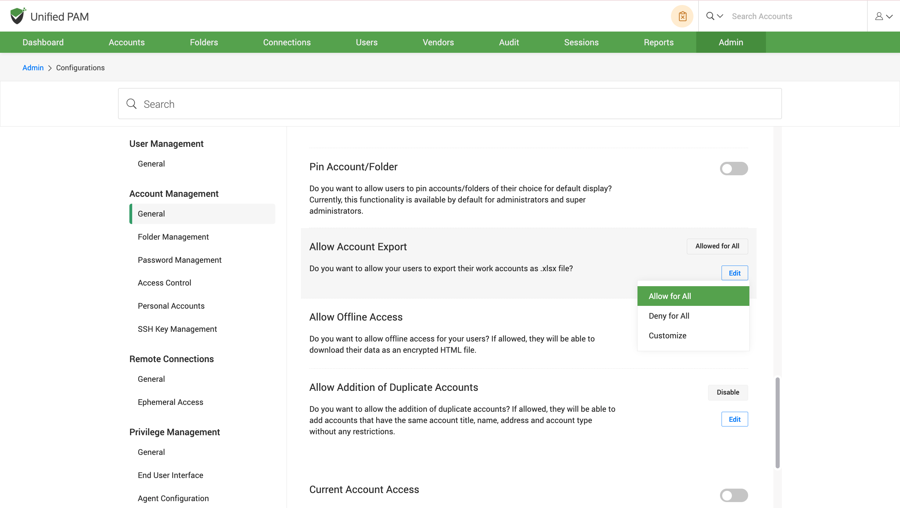 To allow the export of work accounts, navigate to Admin >> Customization >> Configuration >> Account Management >> General, and find the Allow Account Export configuration. Click on the Edit button.
