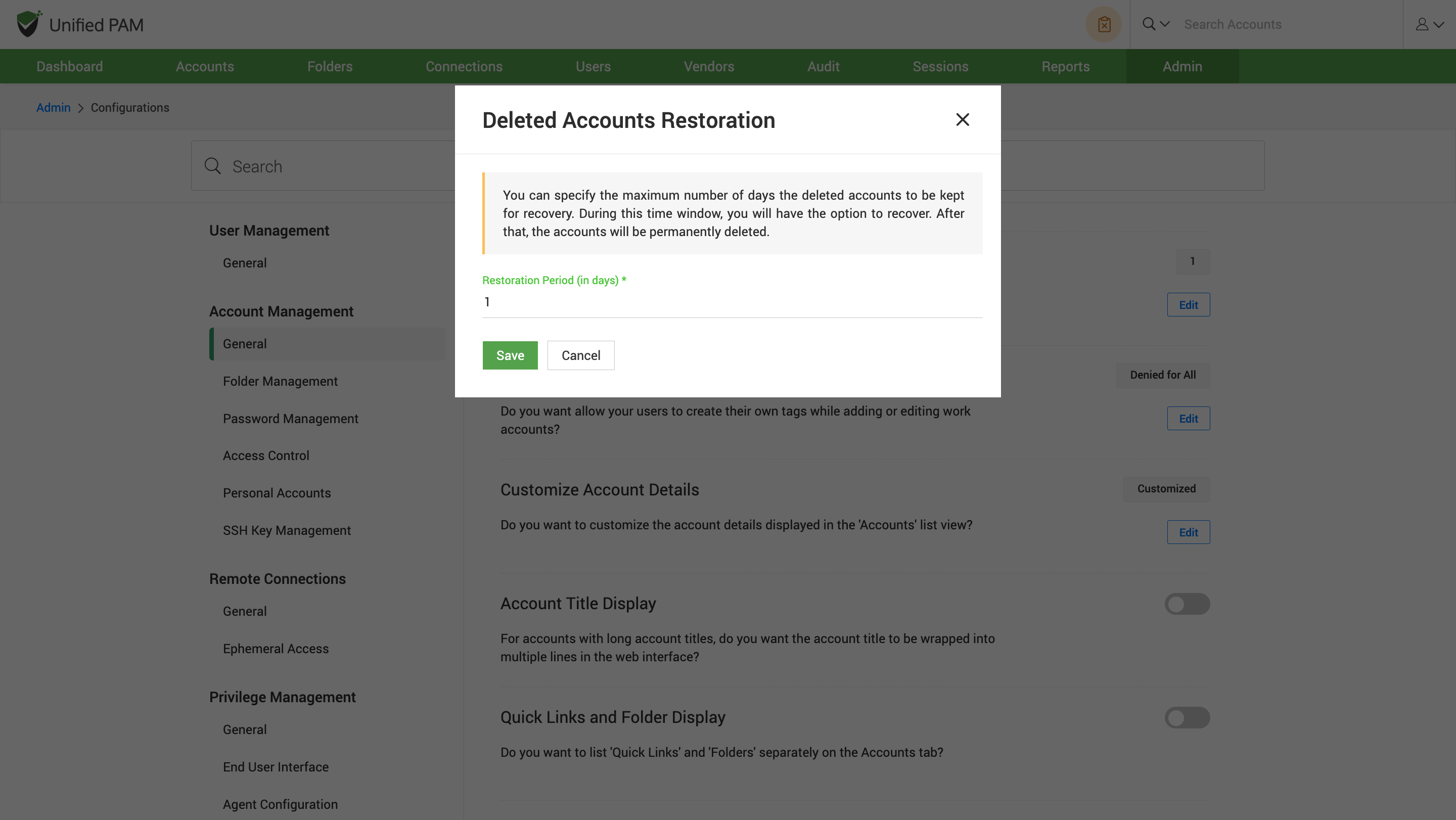 You can choose the maximum number of days for recently deleted accounts to be retained for recovery. During this time window, you will have the option to recover. After that, the accounts will be permanently deleted.