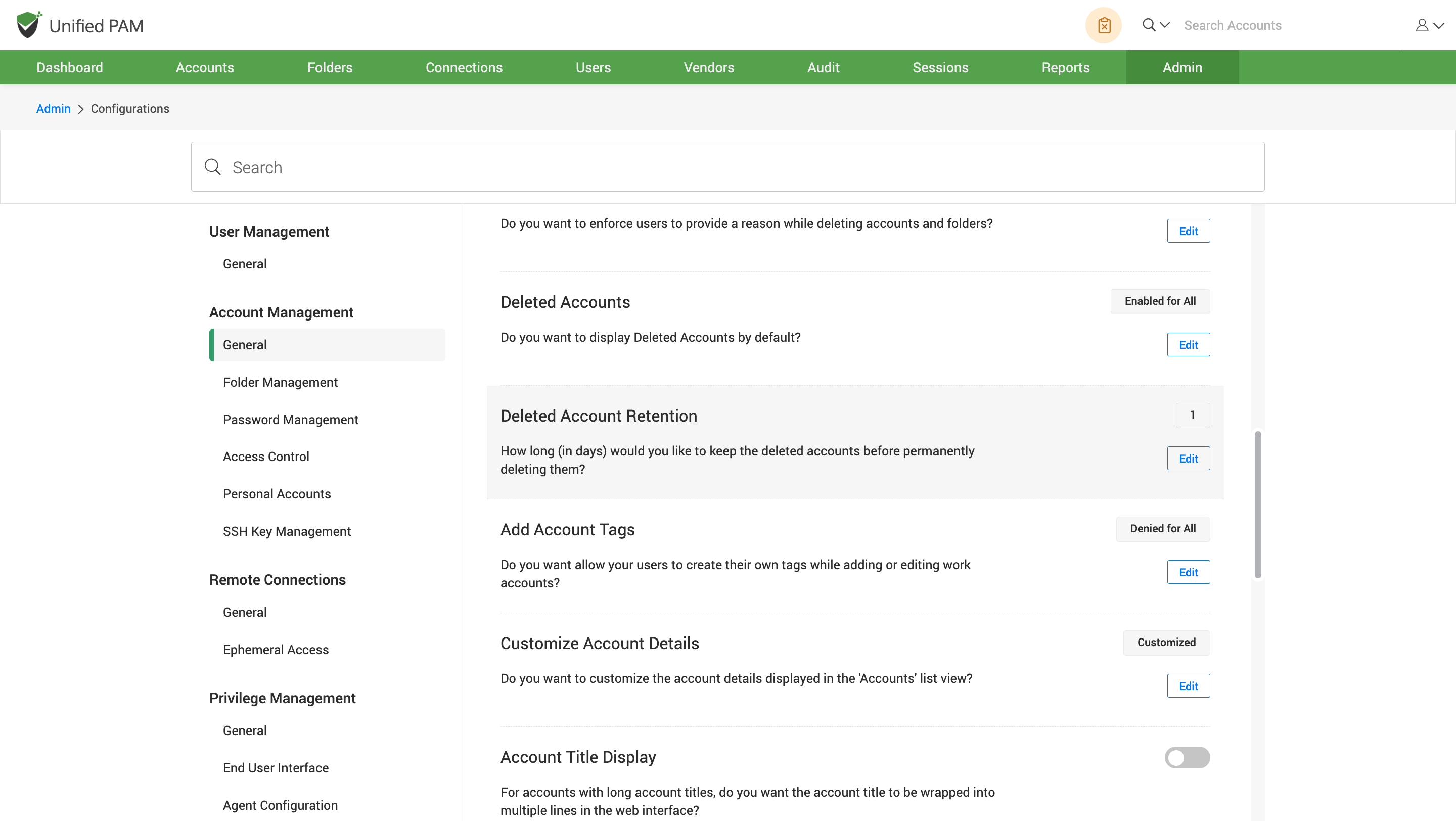 To configure this, navigate to Admin >> Customization >> Configuration >> Account Management >> General, and find the Account Deletion Justification configuration. Click on the Edit button.