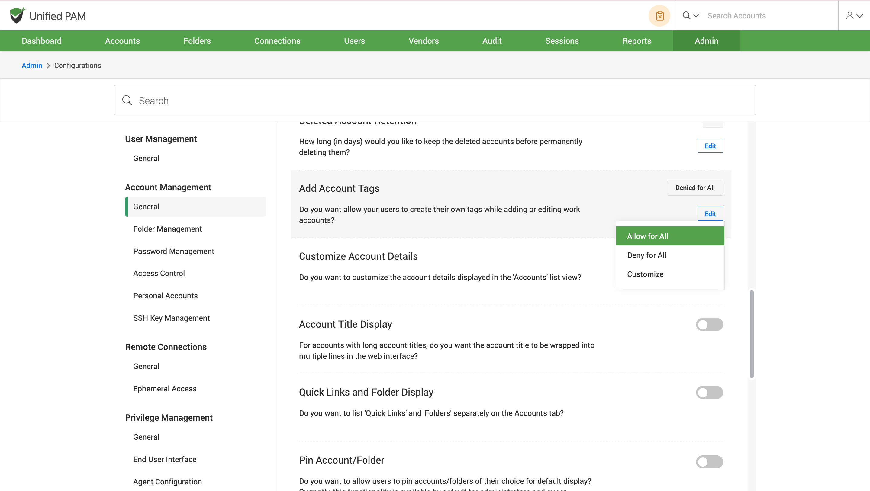 To enable this, navigate to Admin >> Customization >> Configuration >> Account Management >> General, and find the Add Account Tags configuration. Click on the Edit button.