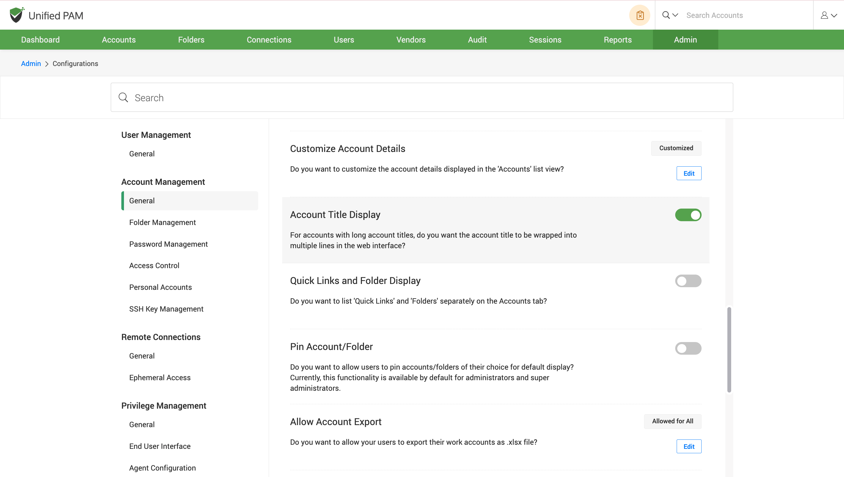 To enable this, navigate to Admin >> Customization >> Configuration >> Account Management >> General, and find the Account Title Display configuration. Slide the toggle button to the right to configure the feature.
