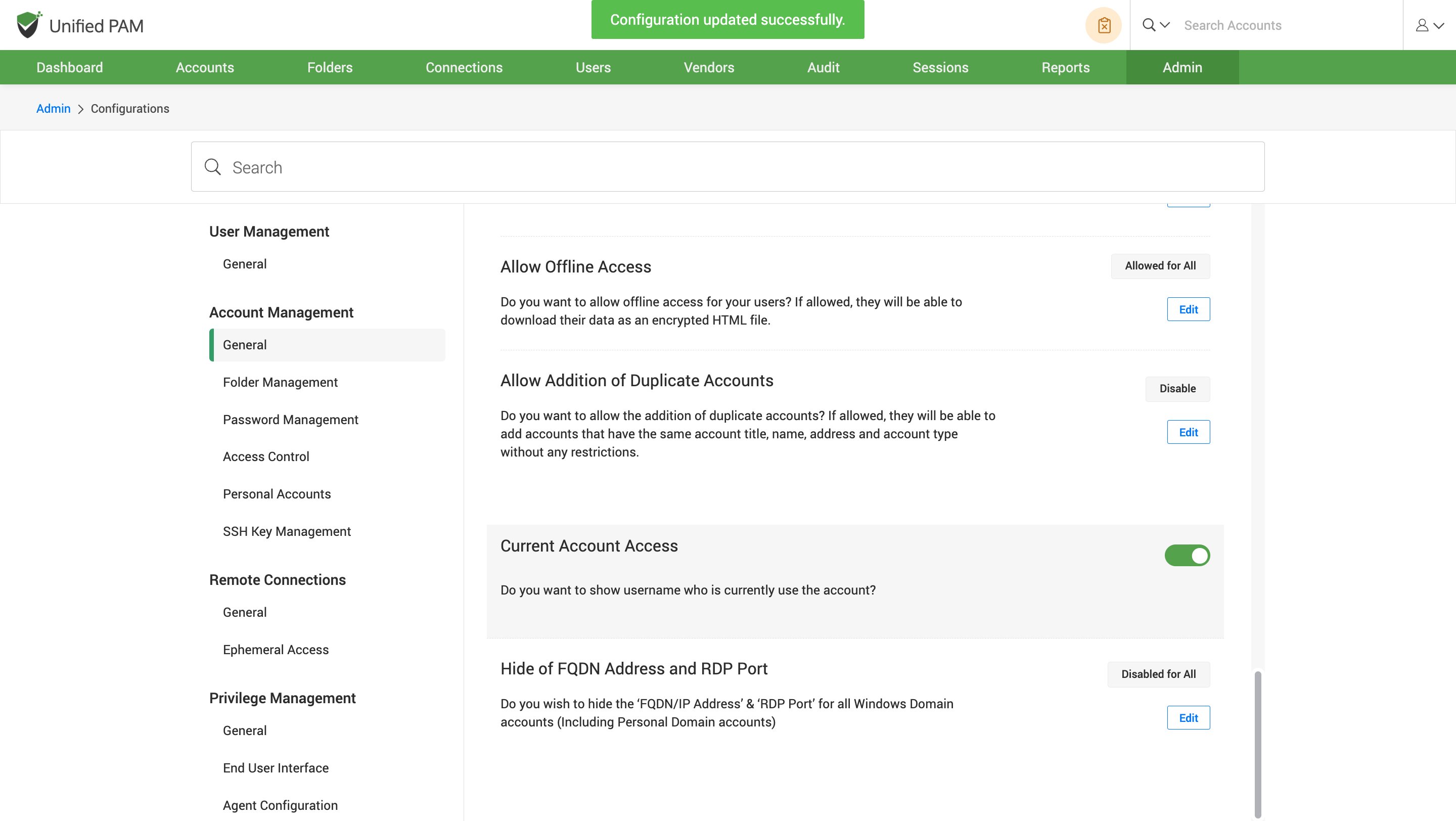 To enable this, navigate to Admin >> Customization >> Configuration >> Account Management >> General, and find the Current Account Access configuration. Slide the toggle button to the right to configure the feature.