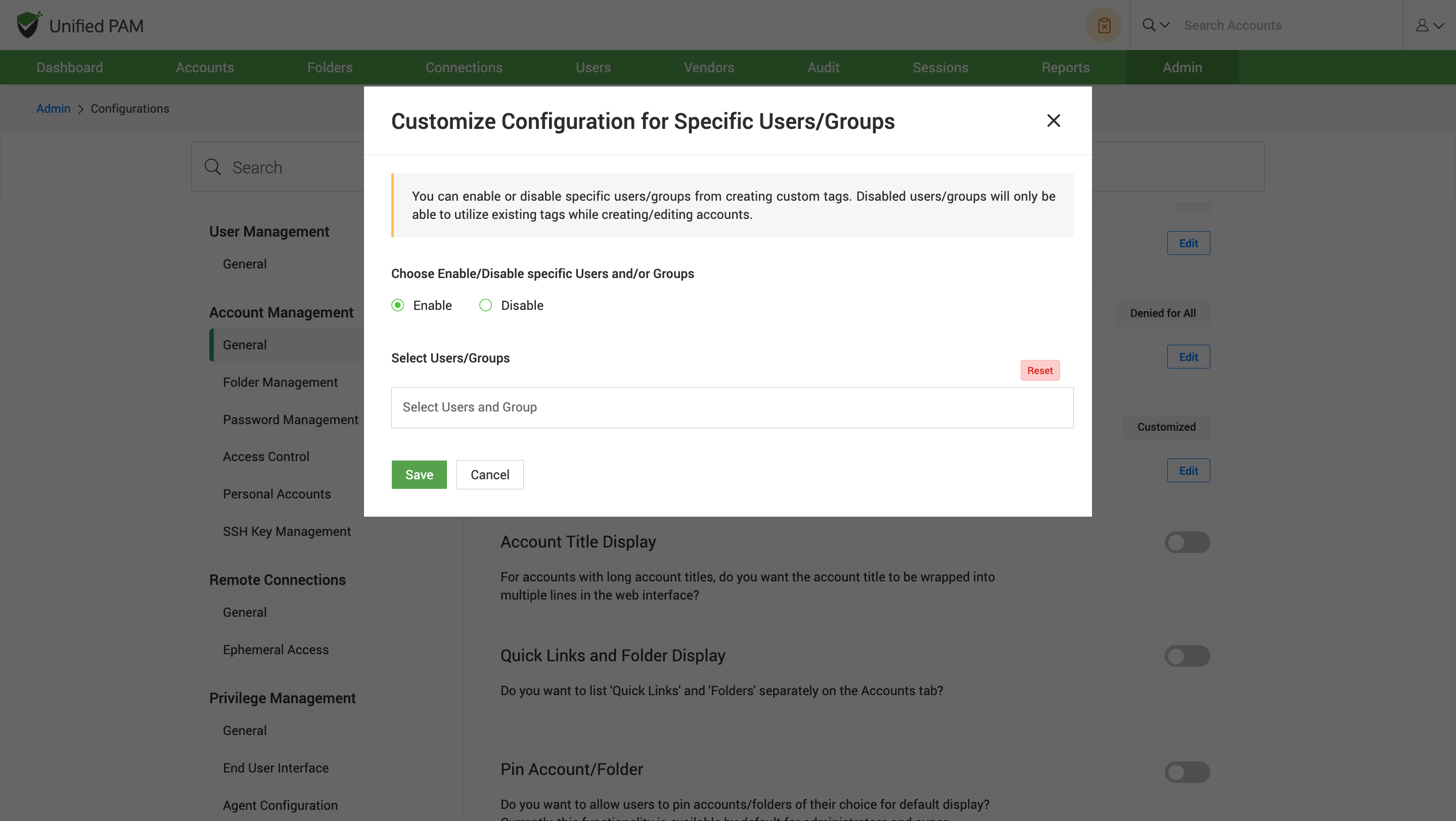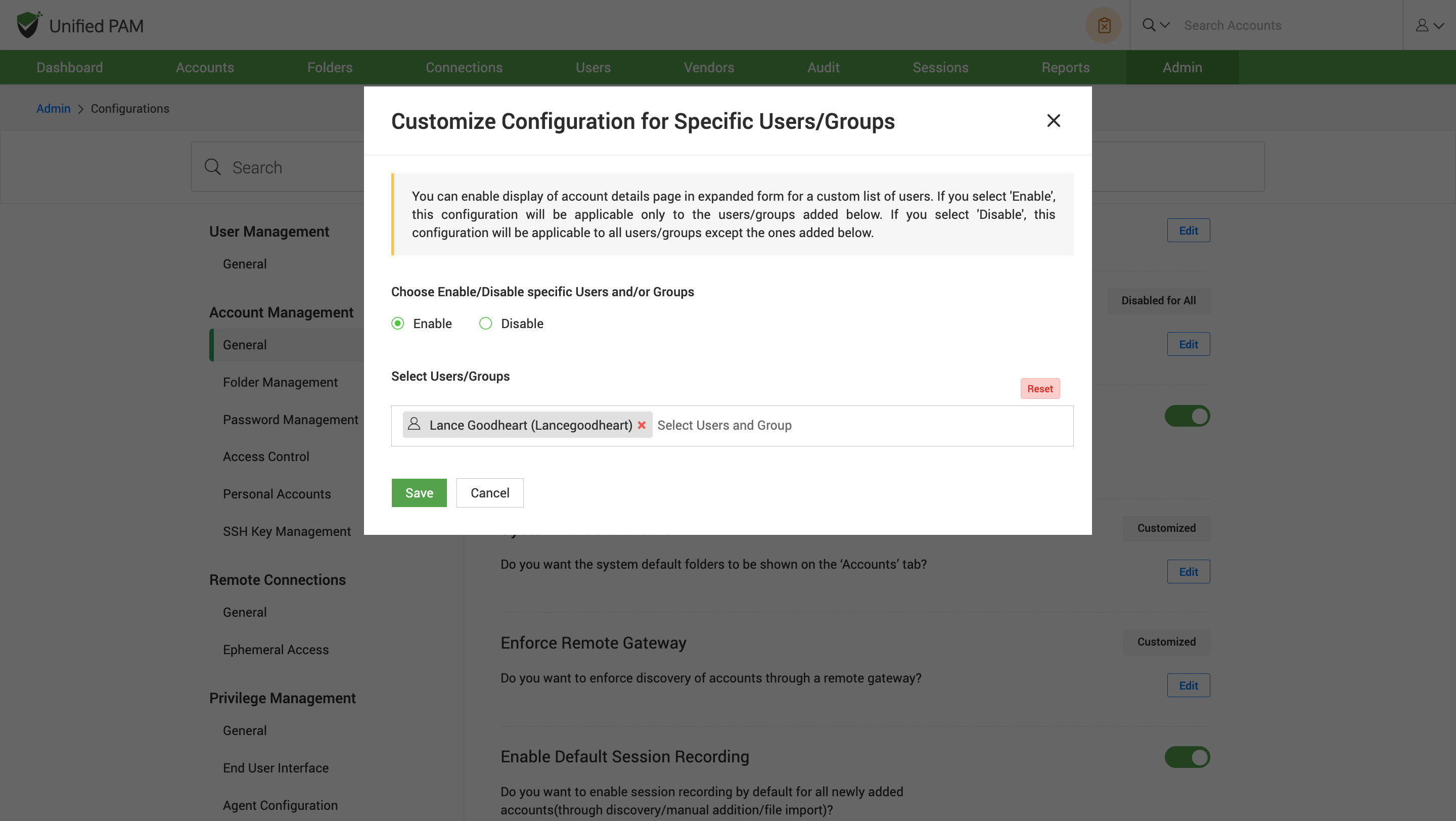 To enable or disable the display account page option for specific users or groups, a custom list of users is created using the Customize option. In accordance with the number of users or groups that require a detailed page of accounts, the list can be customized. Click on the Save button to save the changes.