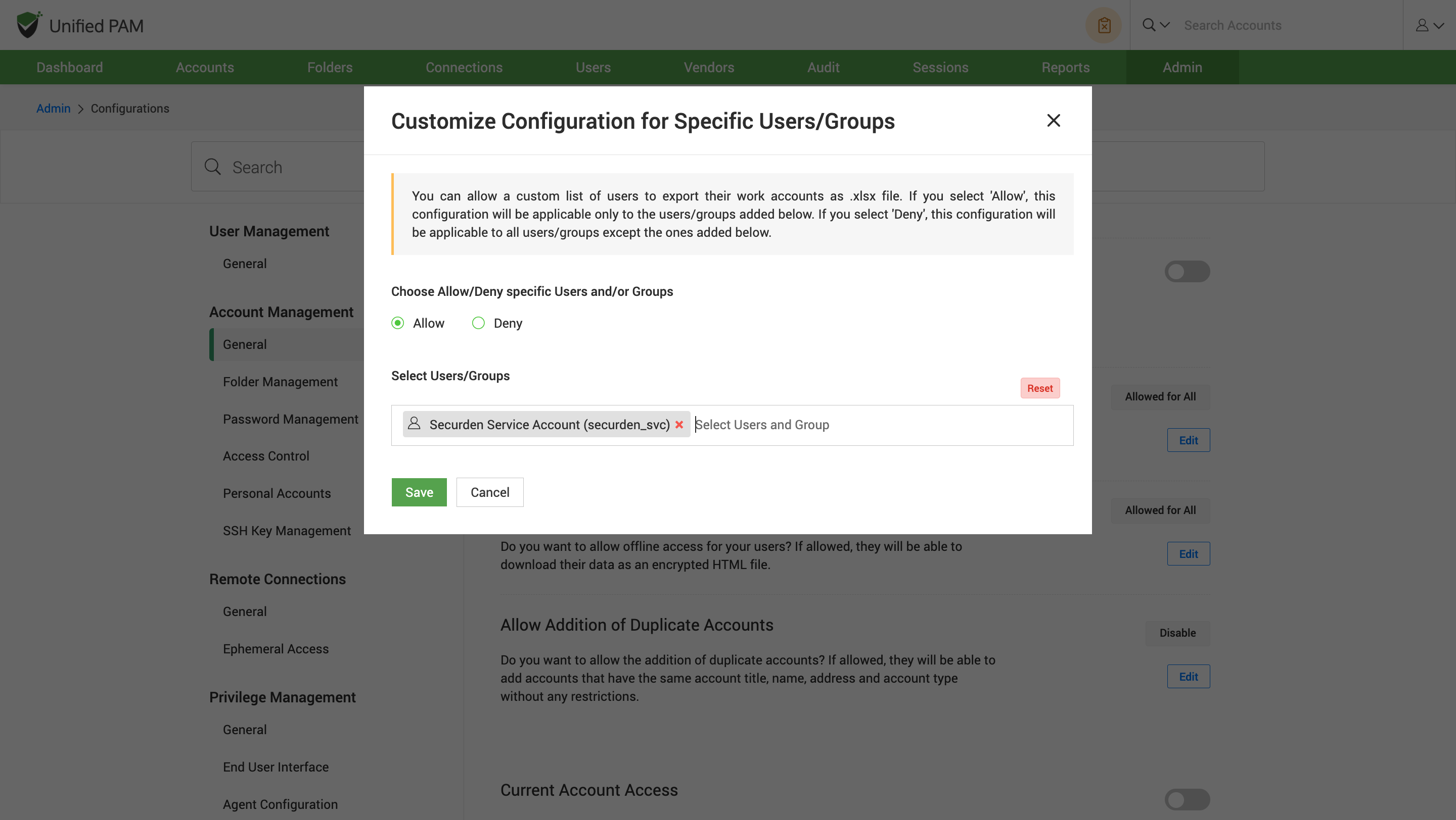 To enable or disable export of work accounts for specific users or groups, a custom list of users is created using the Customize option. In accordance with the number of users or groups that require the list of accounts, the list can be customized. Click on the Save button to save the changes.