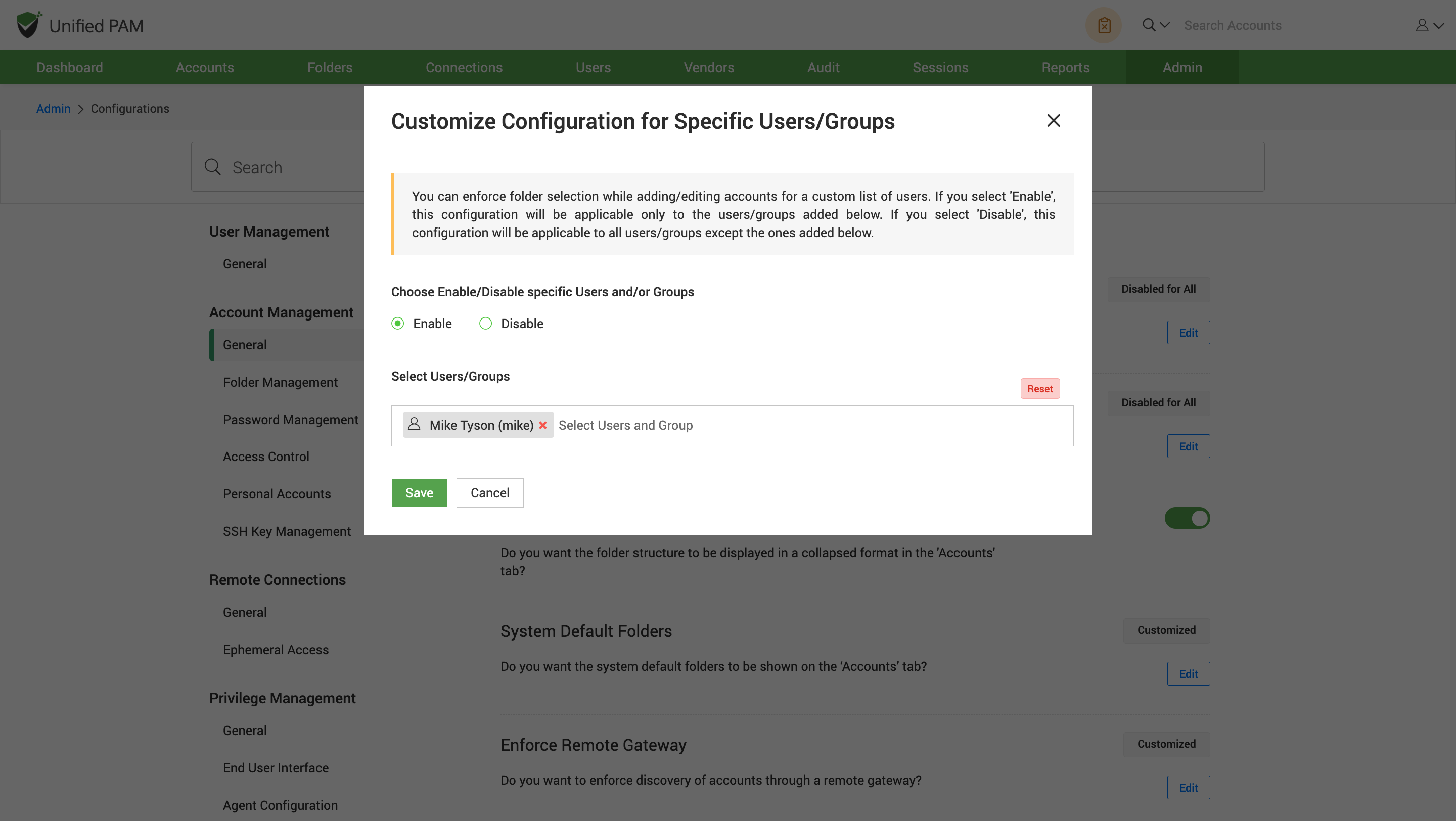 To enable or disable the folder selection option for specific users or groups, a custom list of users is created using the Customize option. This allows you to opt for mandatory account addition to the folder for selected users or groups. Select the users or groups and click on the Save button to save the changes.