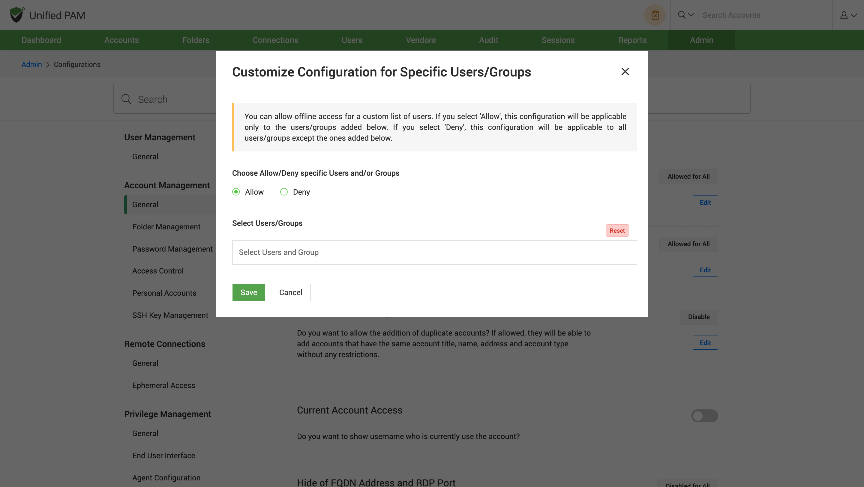 To enable or disable offline access for specific users or groups, a custom list of users is created using the Customize option. In accordance with the number of users or groups that require offline access, the list can be customized. Click on the Save button to save the changes.