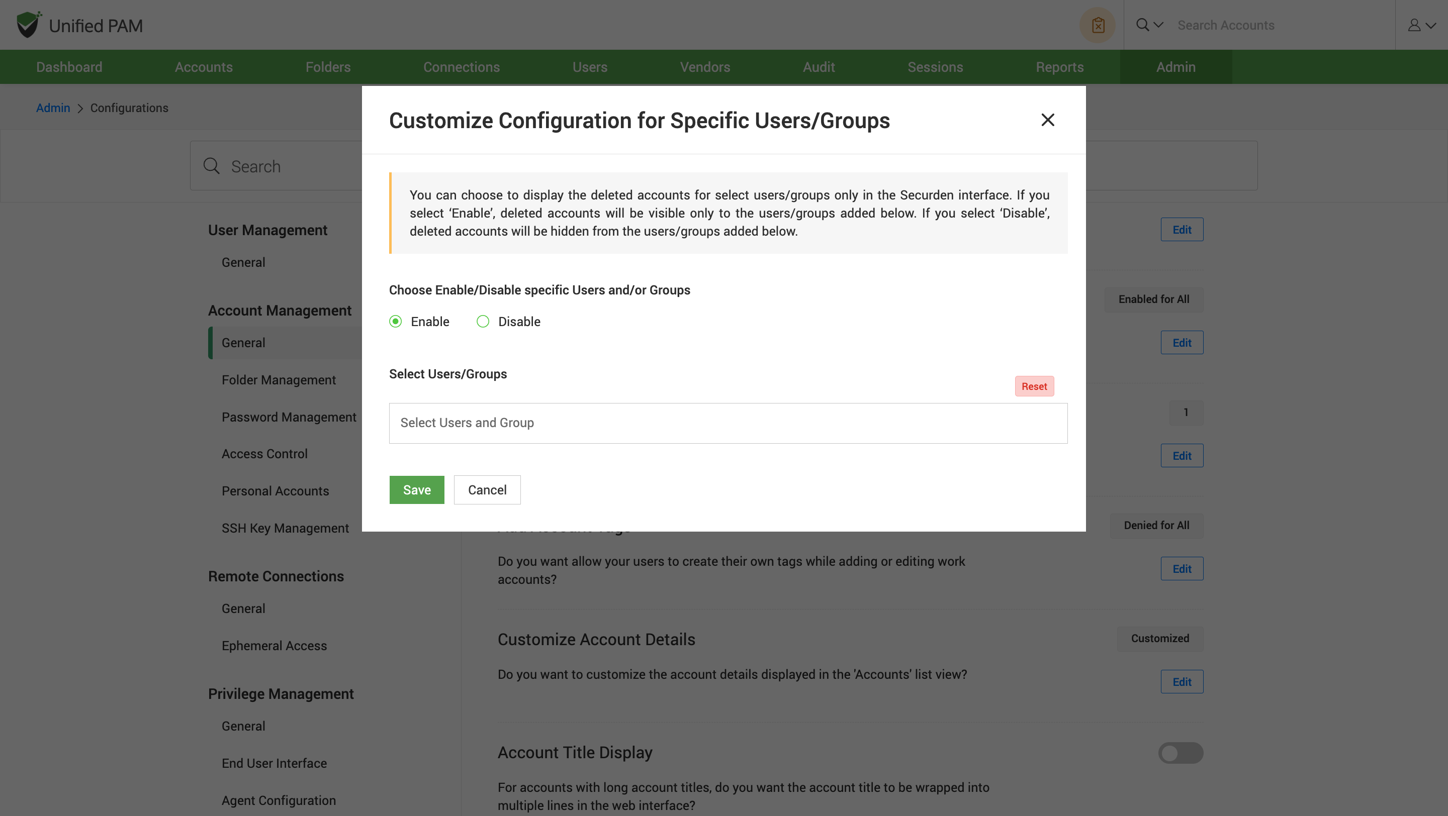 To enable or disable the display deleted accounts option for specific users or groups, a custom list of users is created using the Customize option. If you select ‘Enable’, recently deleted accounts will be visible only to the users/groups added below. If you select ‘Disable’, recently deleted accounts will be hidden from the users/groups added below. Click on the Save button to save the changes.