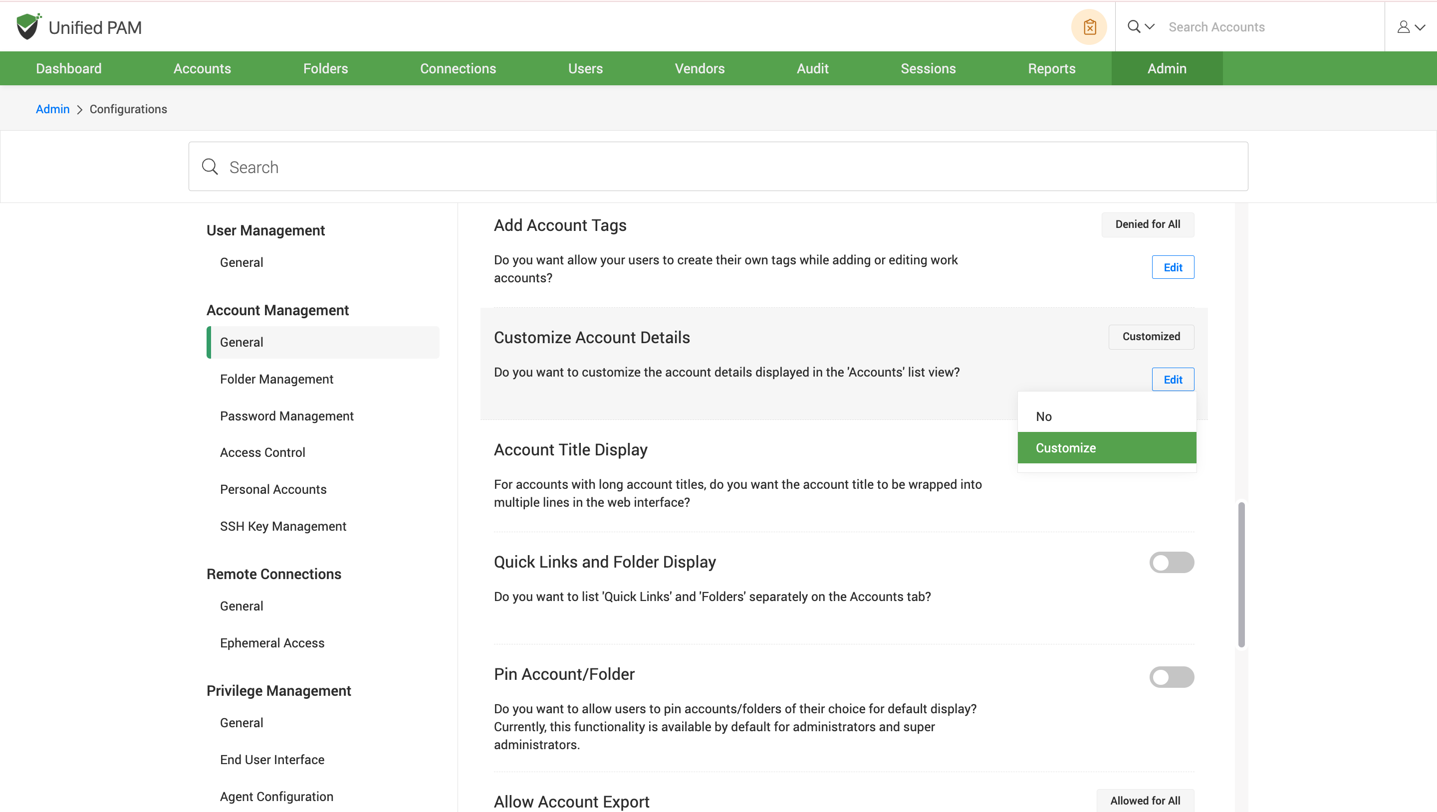 To customize the details, navigate to Admin >> Customization >> Configuration >> Account Management >> General, and find the Customize Account Details configuration. Click on the Edit button.