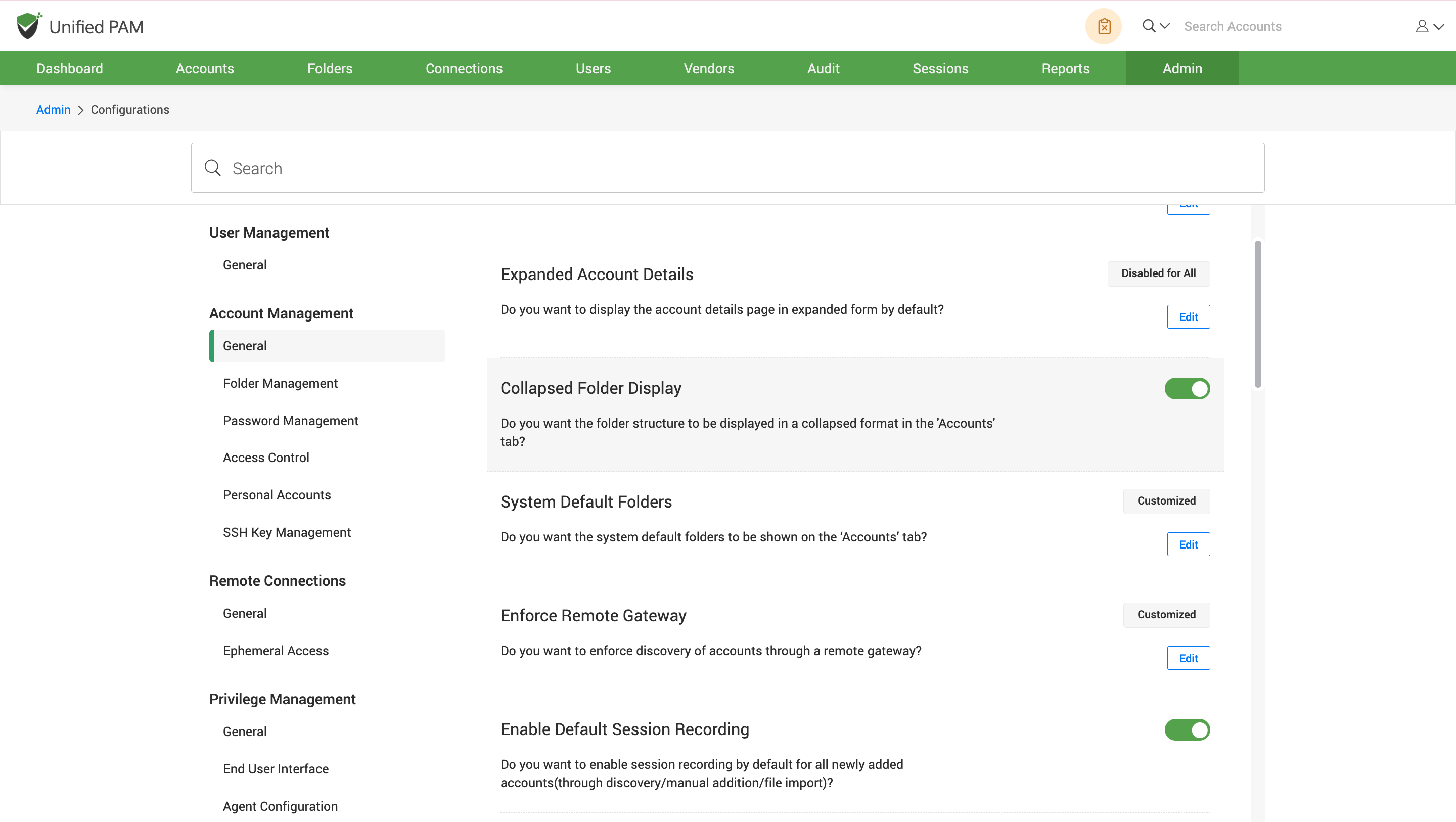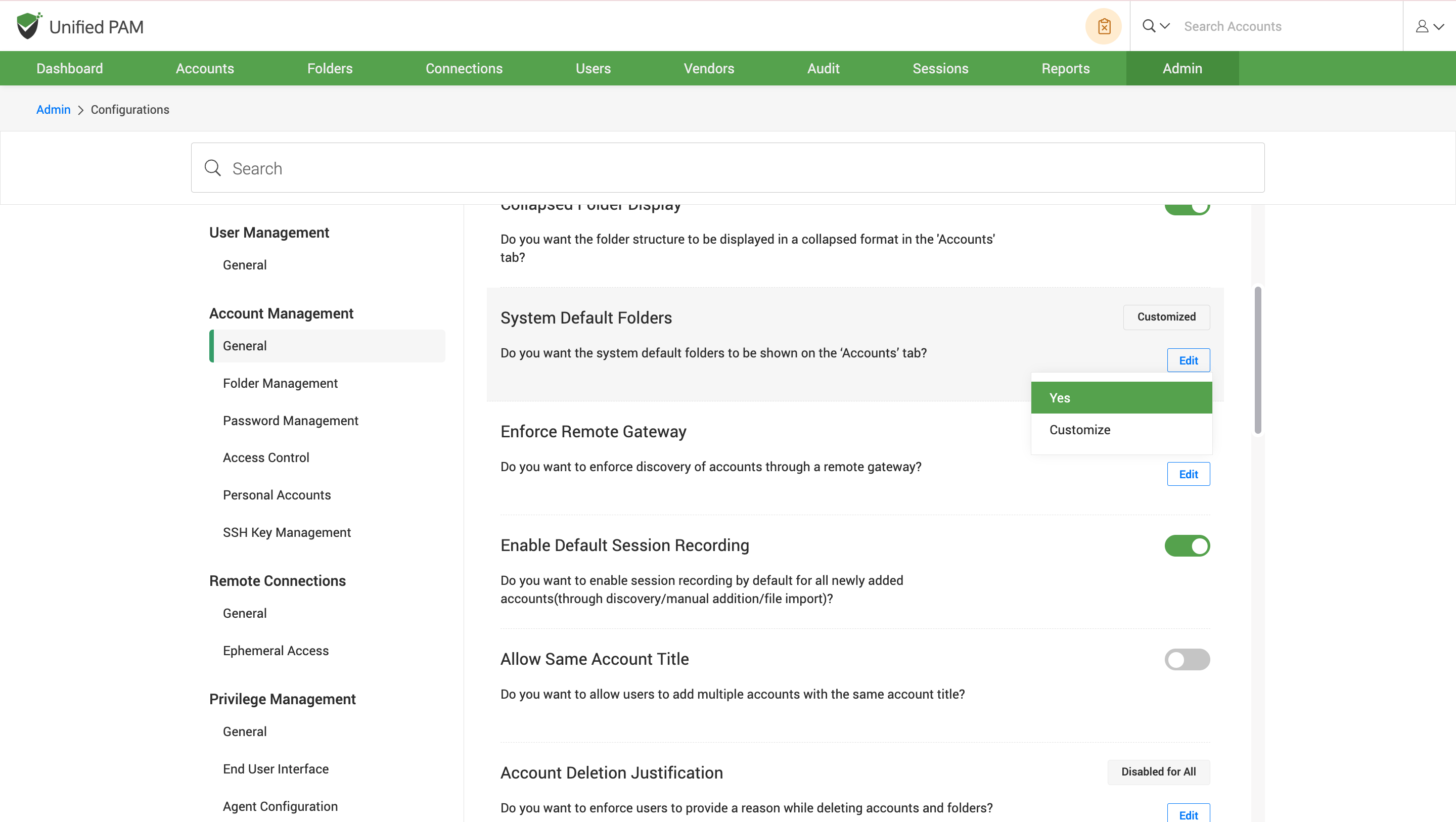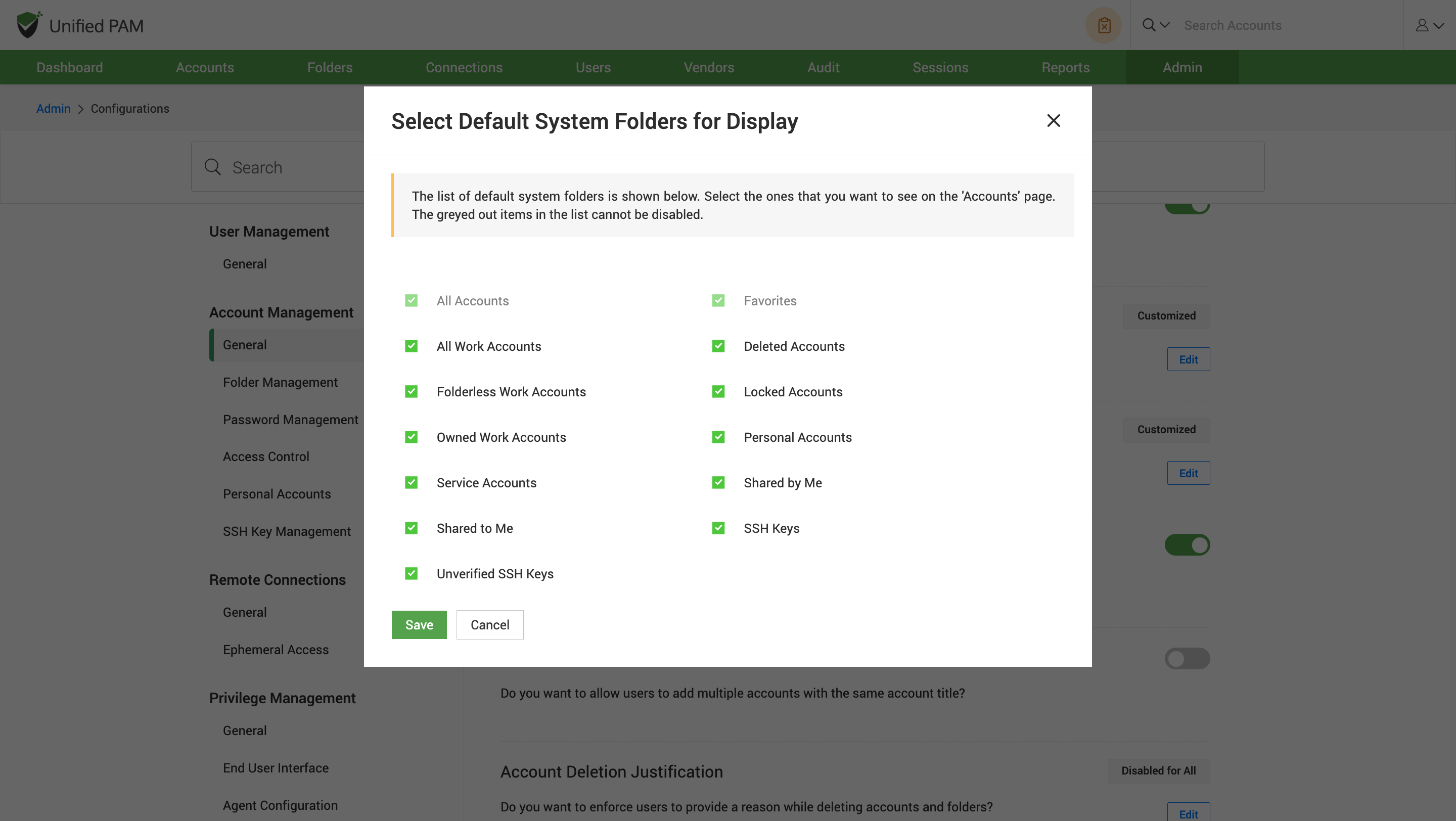 The default folders help to group the accounts of a particular section within a single folder. The default folders include sections such as personal accounts, service accounts, locked accounts and SSH keys. You can select the default folders to display on the ‘Account’ tab according to your requirements.