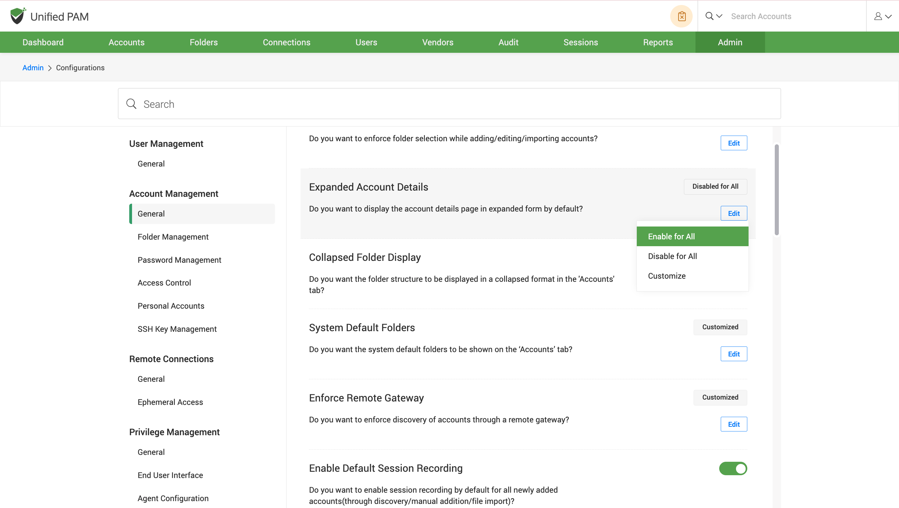 To enable expanded detail page of accounts, select Enable for All and Disable for All to disable the default setting of displaying the page.