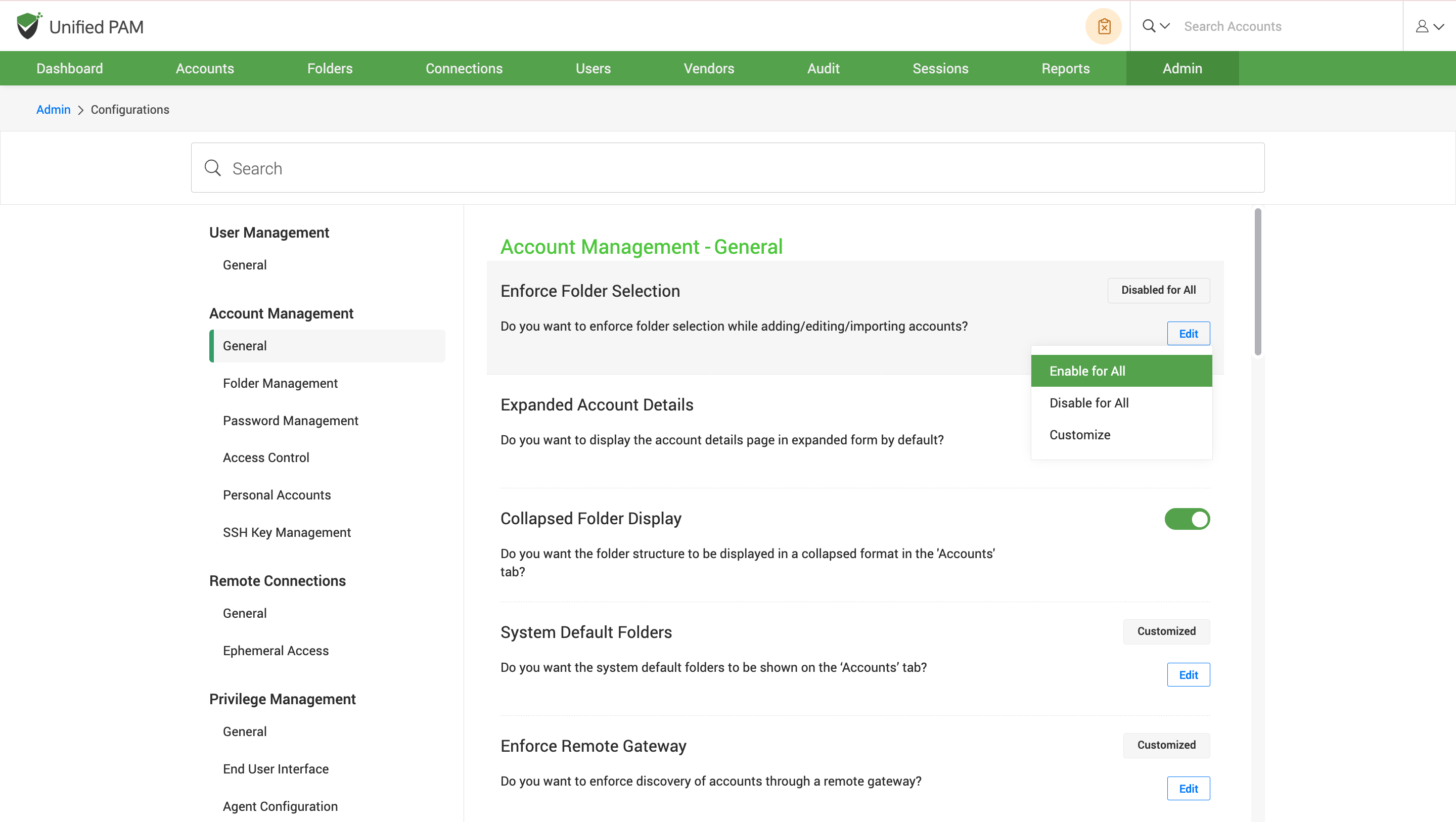 If you enable this option, it becomes mandatory to select a folder while adding or importing an account into the product. To enable folder selection for accounts, select Enable for All and Disable for All to disable the enforcement on accounts.