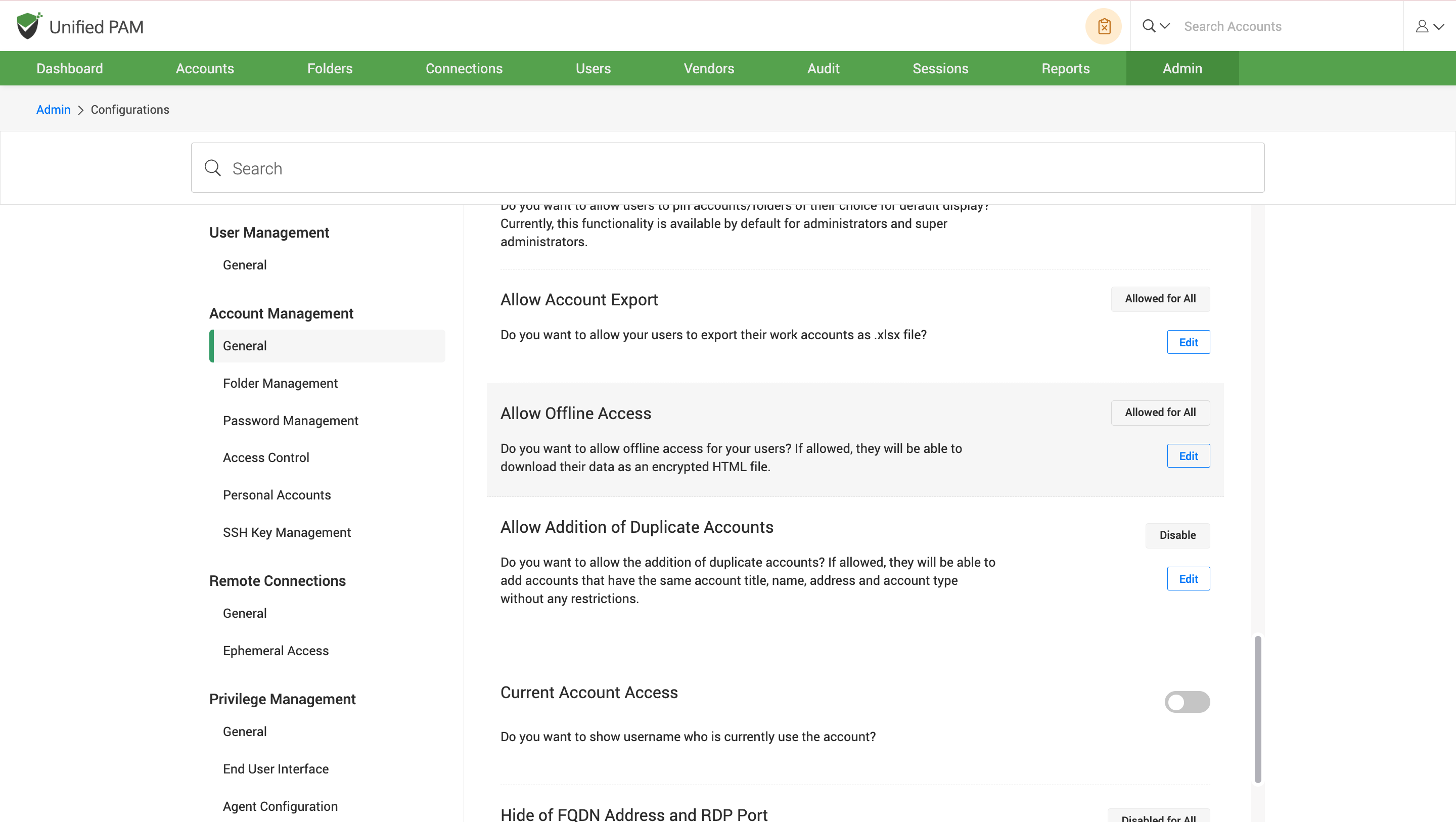 To enable this, navigate to Admin >> Customization >> Configuration >> Account Management >> General, and find the Allow Offline Access configuration. Click on the Edit button.