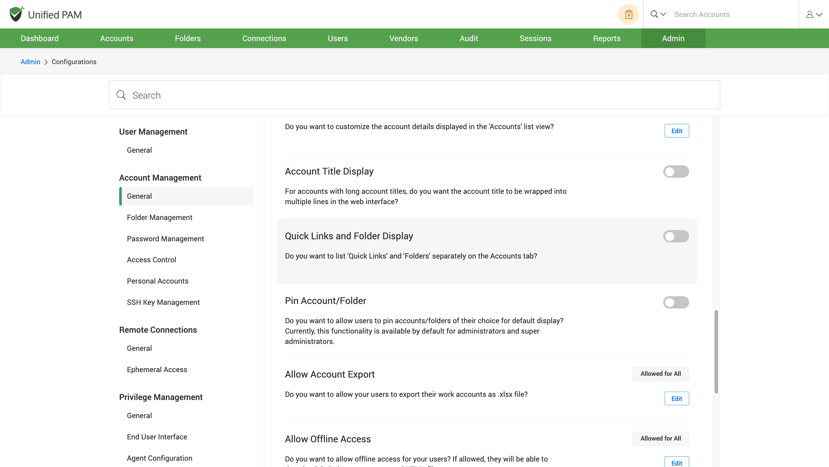 To enable this, navigate to Admin >> Customization >> Configuration >> Account Management >> General, and find the Quick Links and Folder Display configuration. Slide the toggle button to the right to configure the feature.