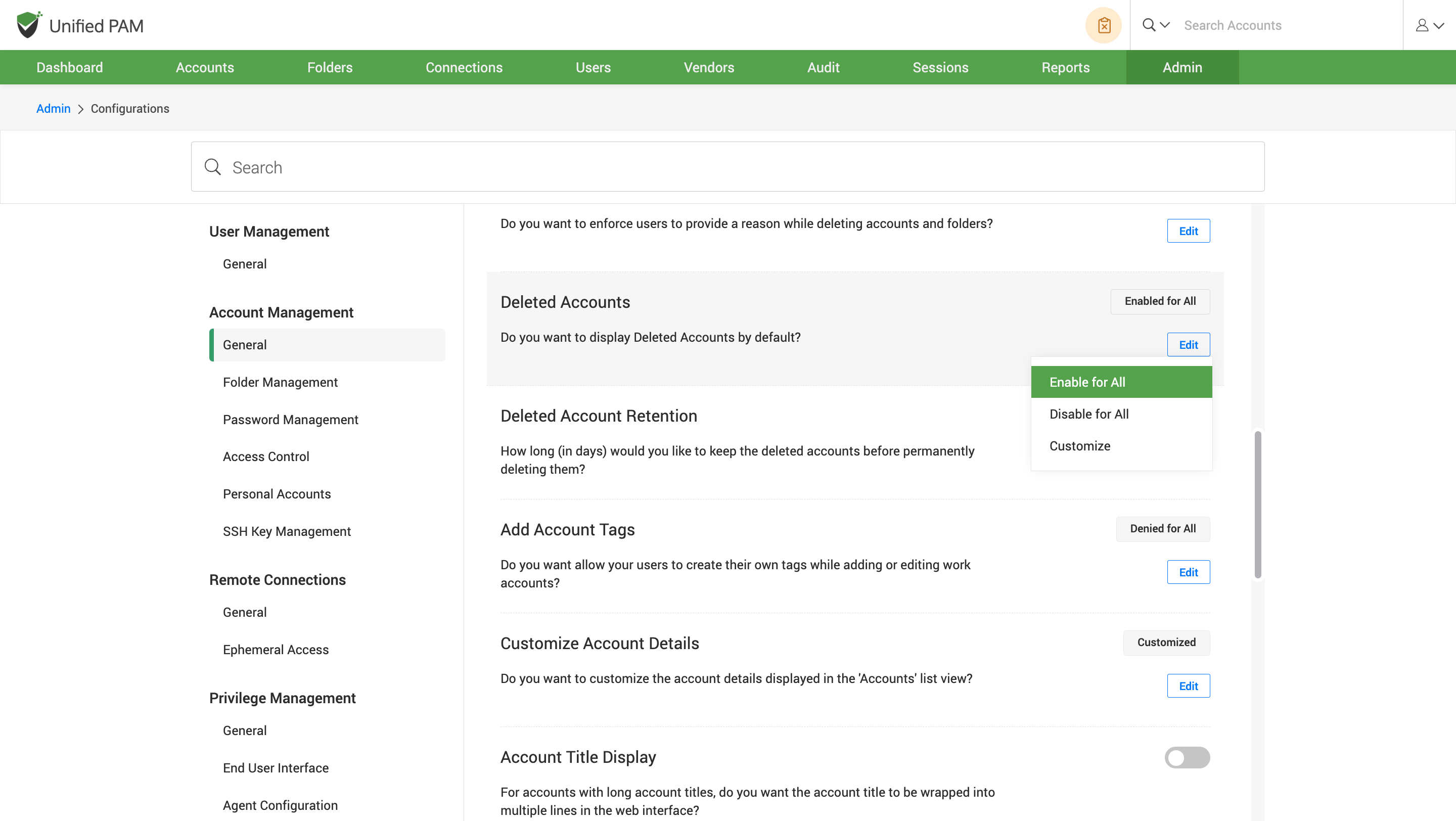 To display this, navigate to Admin >> Customization >> Configuration >> Account Management >> General, and find the Deleted Accounts configuration. Click on the Edit button.