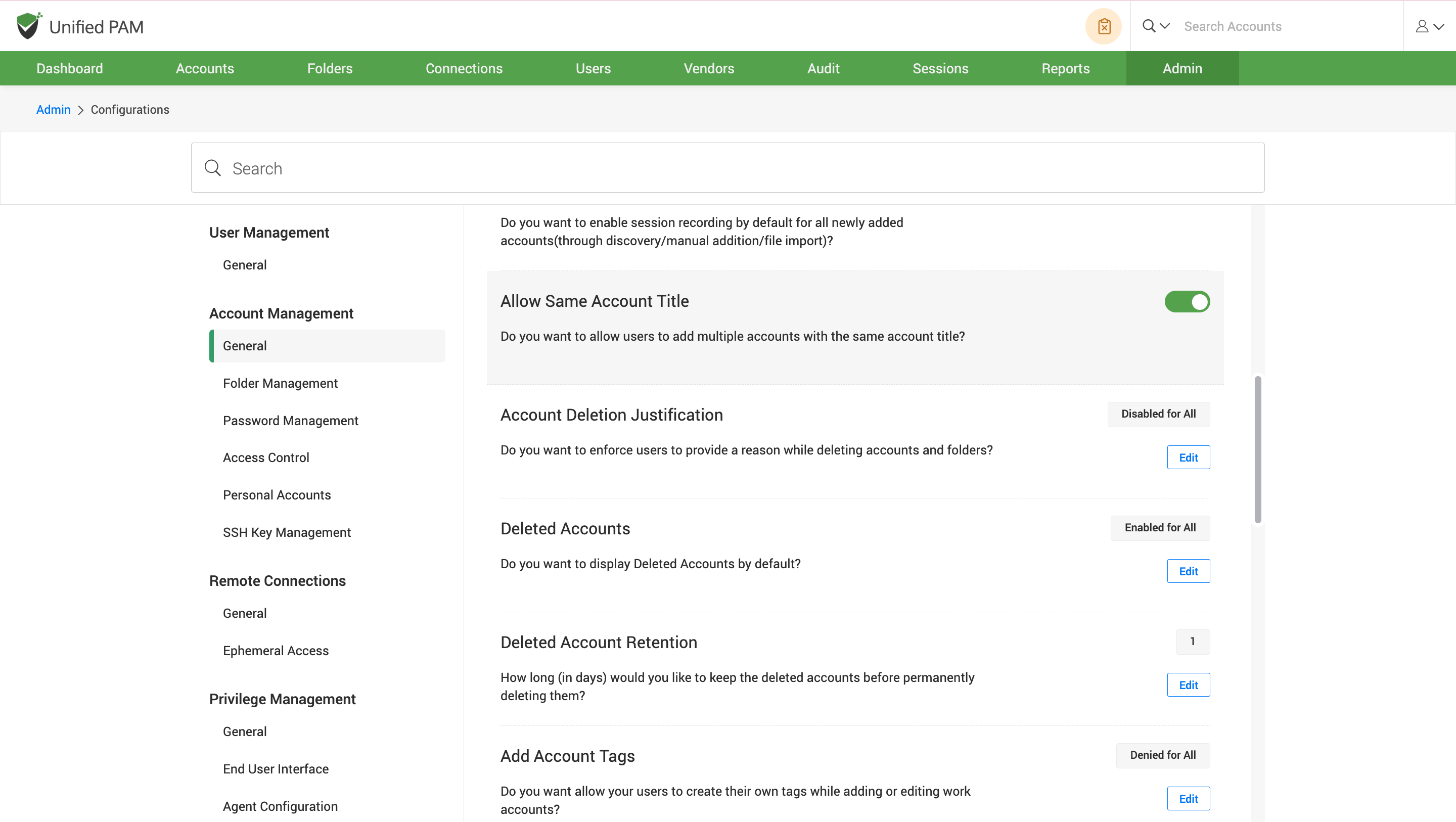 You can enable session recording by default for all the newly added accounts such as accounts that are added through account discovery, manually and by importing from a file.