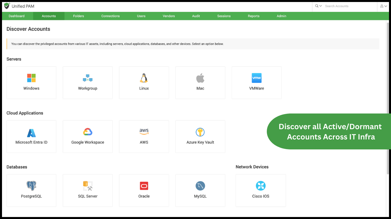 Securden scans your network, discovers devices and all accounts therein, including dormant accounts, and consolidates them for efficient administration. The different types of accounts discovered include: