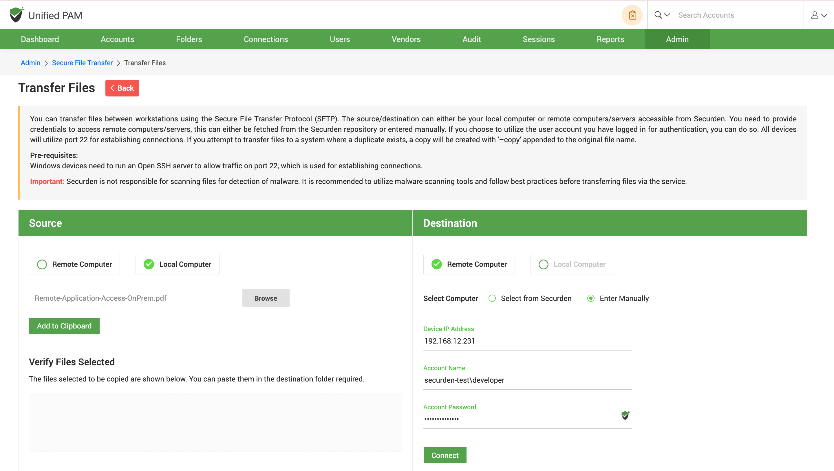File-sharing programs and removable media are major vectors that contribute to malware propagation. If your organization has Securden in place, files and documents can be transferred through the PAM interface.